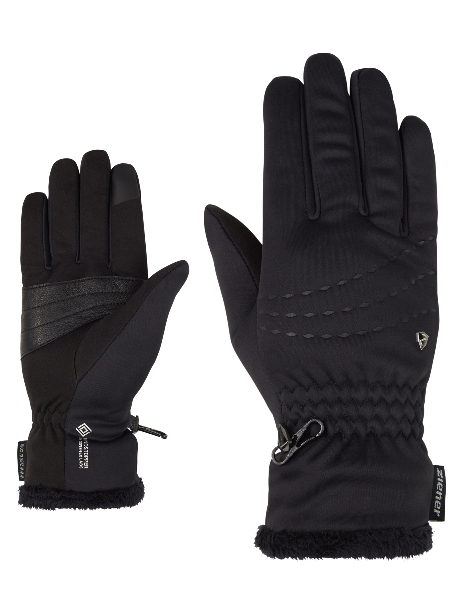 Die klassischen ZIENER Freizeithandschuhe INDIRI WS TOUCH LADY aus Softshell-Material sind mit weichem und wärmendem Plüschfutter ausgestattet, das auch am Bündchen sichtbar ist. Sie punkten zudem mit der GORE® WINDSTOPPER® Produkttechnologie – das macht sie absolut winddicht und atmungsaktiv. Eine zusätzliche Verstärkung der Innenhand durch einen Lederpatch sorgt für perfekte Robustheit und herausragendes Griffgefühl. Mit der integrierten TOUCH Funktion können Touchscreens bedient werden, ohne dass dabei die Handschuhe ausgezogen werden müssen. Der Gummizug sorgt für eine angenehme Passform und einen guten Halt am Handgelenk. Das Produkt verfügt über recyceltes Material – für einen ressourcenschonenden Umgang. Enthält nichttextile Teile tierischen Ursprungs.