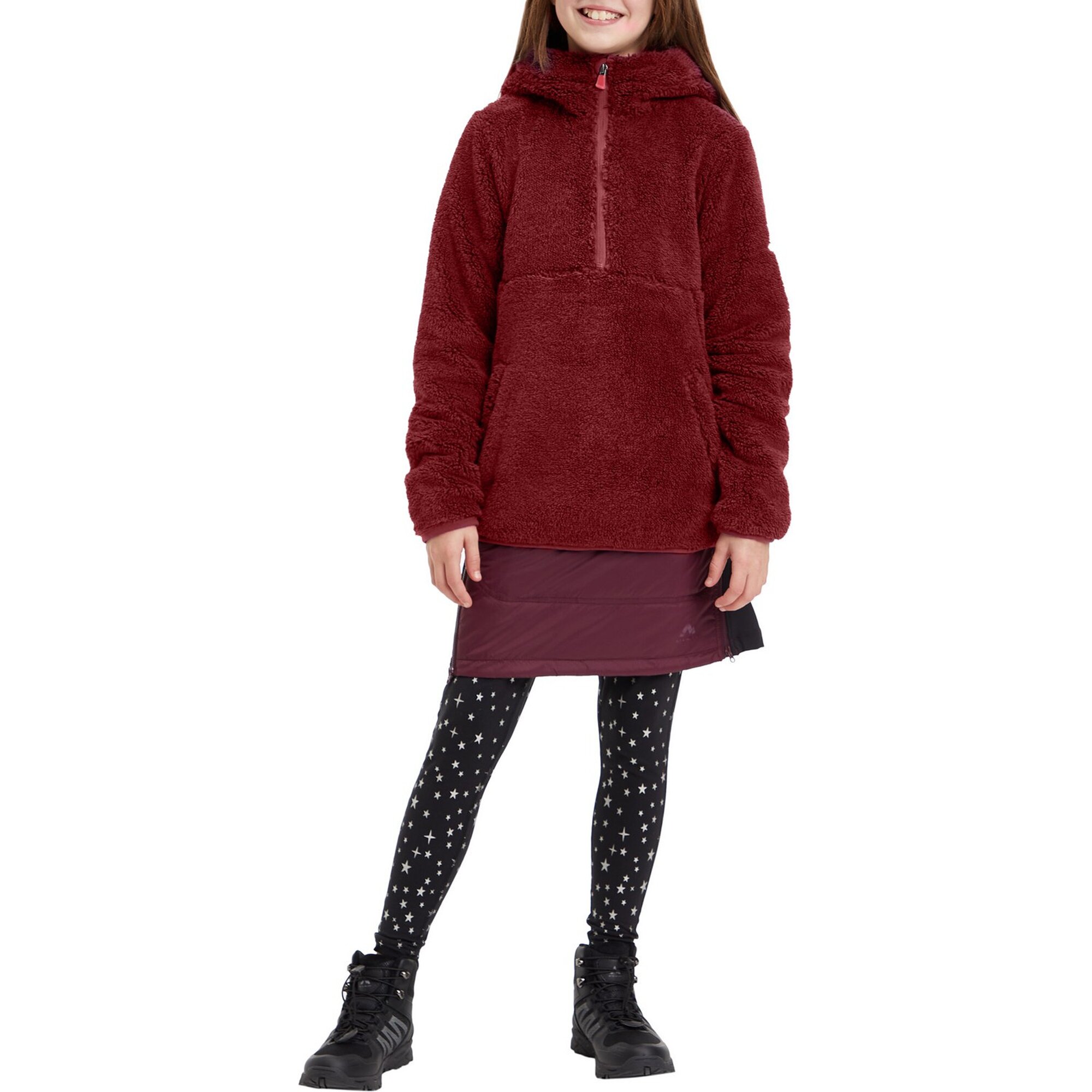 Wenn es raus in die Natur geht, hält der Outdoor-Fleecepullover Gloria von McKINLEY kuschelig warm. Sein Material aus Teddyfleece sorgt für eine herausragende Wärmeisolation an kühleren Sommertagen oder im Herbst. Das mit einem Antipilling-Finish versehene Polyestergewebe erweist sich zudem als sehr strapazierfähig und sorgt dank atmungsaktiver und schnelltrocknender Eigenschaften auch für ein gutes Trageklima. Der Pullover besitzt eine angeschnittene Kapuze, einen Kinnschutz, Einschubtaschen und Lycrabündchen am Ärmel- und Saumabschluss.
