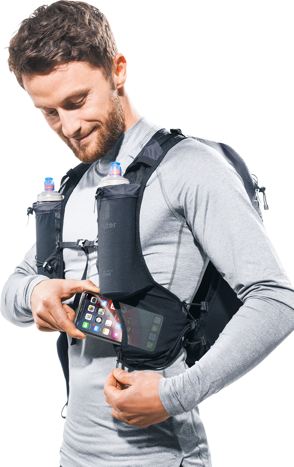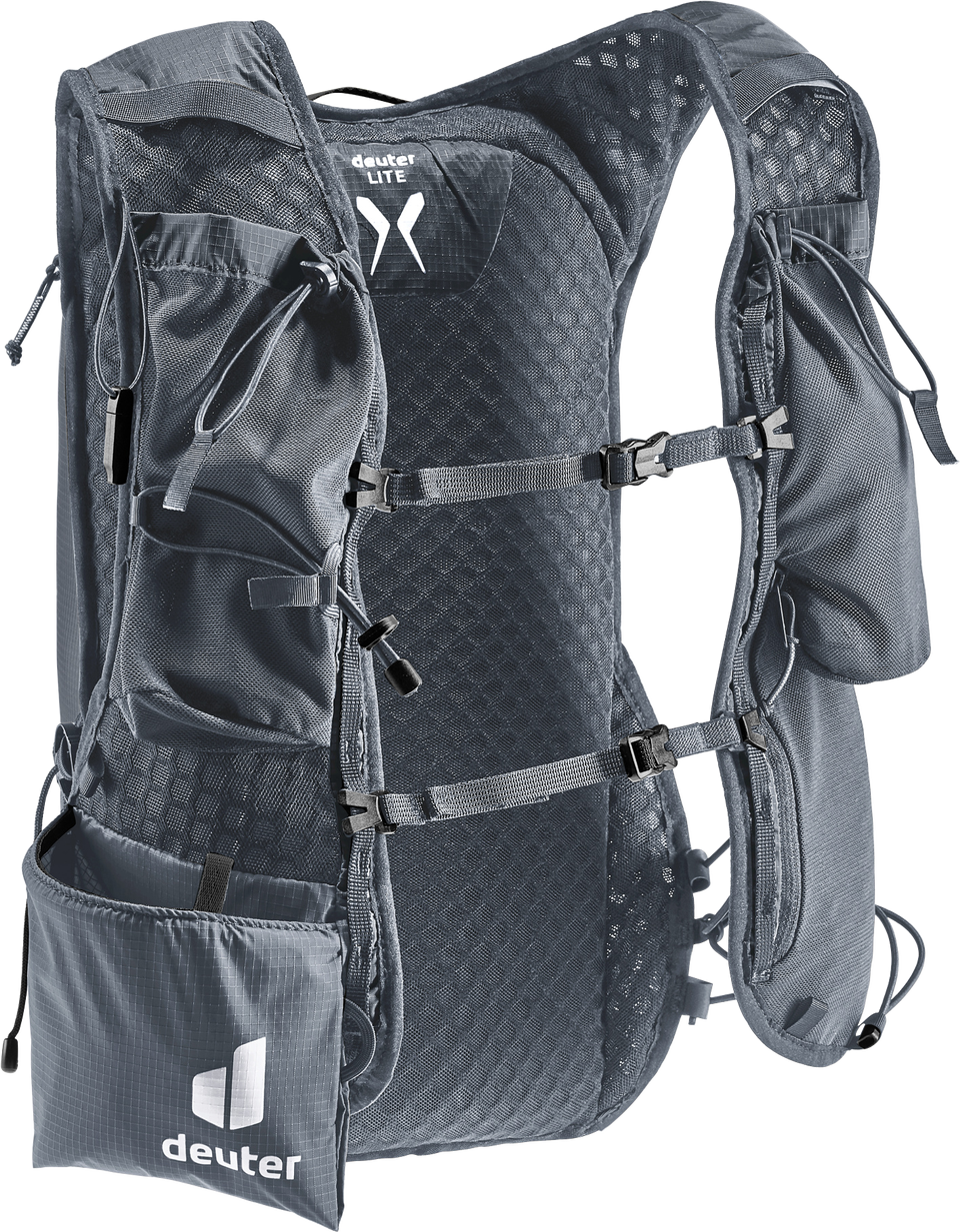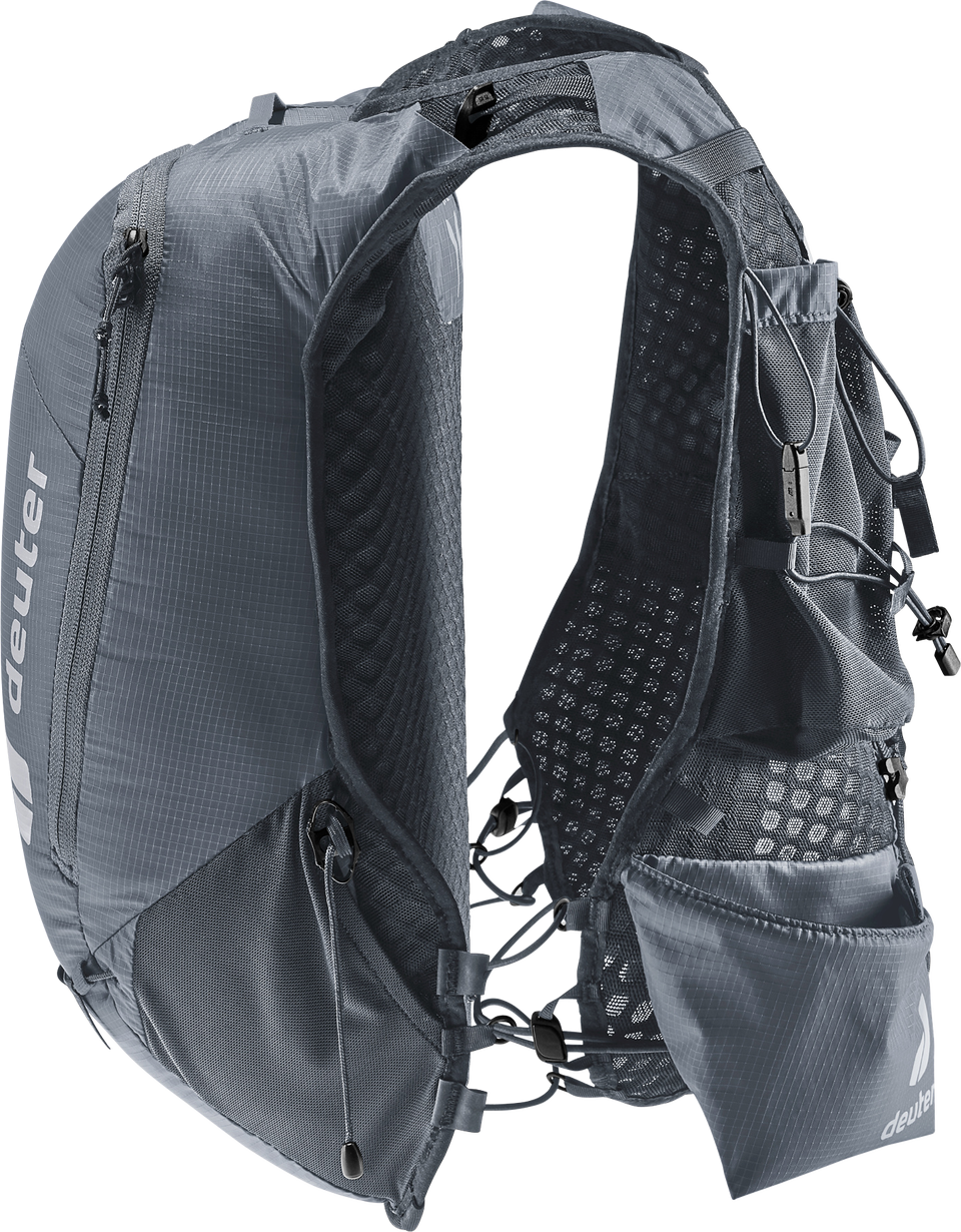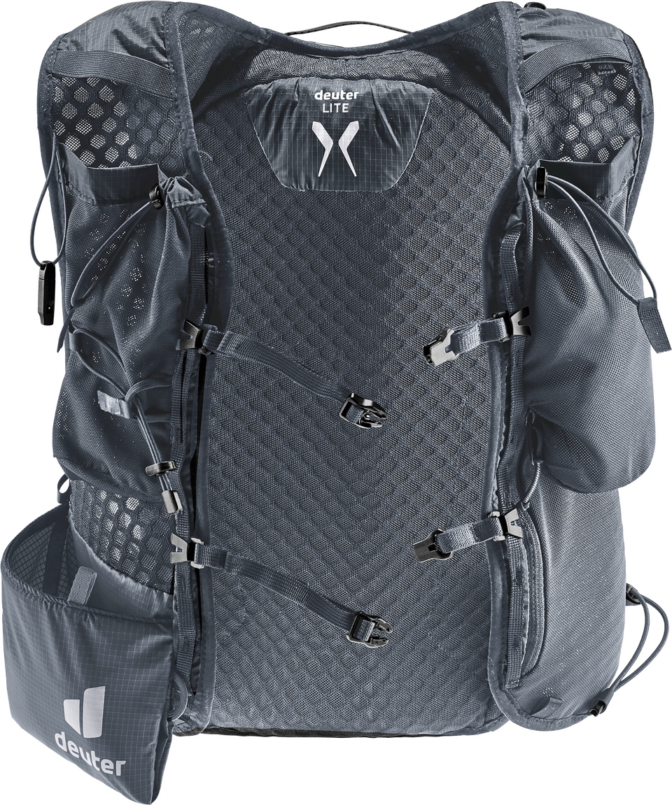 Leichtgewicht mit Komfort: ergonomische, westenförmige Schulterträger mit elastischem Kompressionsgurt, verstellbare Brustgurte und ein weiches Rückenmaterial lassen den Rucksack eng am Oberkörper anliegen. Zudem sorgen die Netzinnentasche und seitlichen Kompressionsriemen für eine Minimierung der Auf- und Abbewegung der Ladung beim Laufen. Die Holster-Stockhalterung am Schultergurt bietet schnellen Zugriff auf die Stöcke. Auch Softflask und GPS sind in den Taschen der Schulterträger stets griffbereit. Das Hauptmaterial des Trailrunnig-Rucksacks ist zu 100% recycelt und bluesign(R) zertifiziert.